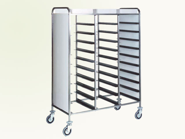 Kolica za tacne s bočnim stranicama. Struktura i vodilice od nerđajućeg čelika - gumeni odbojnici - višesmjerni točkovi ø 125 mm. Standardno pripremljen za GN1/1 tacne – 53×32,5 cm. Kapacitet 30 tacni.