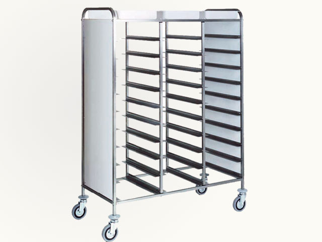 Kolica za tacne s bočnim stranicama u bijelom perfexu, nerđajućem čeliku ili wenge boji. Struktura i vodilice od nerđajućeg čelika - gumeni odbojnici - višesmjerni točkovi ø 125 mm. Standardno pripremljen za GN1/1 tacne – 53×32,5 cm. Kapacitet 30 tacni.