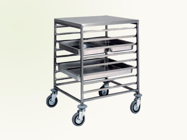 Struktura i vodilice od nerđajućeg čelika - gumeni odbojnici - višesmjerni točkovi ø 125 mm. Standardno pripremljen za GN2/1 (8 tacni) ili GN1/1 (16 tacni). Tacne ne dolaze uz kolica.