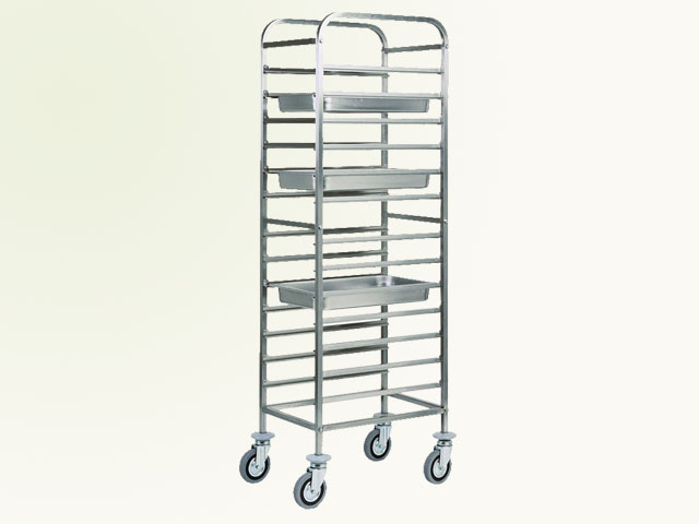 Struktura i vodilice od nerđajućeg čelika - gumeni odbojnici - višesmjerni točkovi ø 125 mm. Kapacitet 14 tacni. Tacne nisu uključene u cijenu.