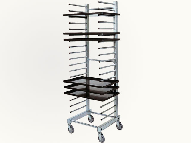 Struktura i vodilice od nerđajućeg čelika - gumeni odbojnici - višesmjerni točkovi ø 125 mm. Kapacitet 20 tacni 60 x 40 cm. Tacne nisu uključene u cijenu.