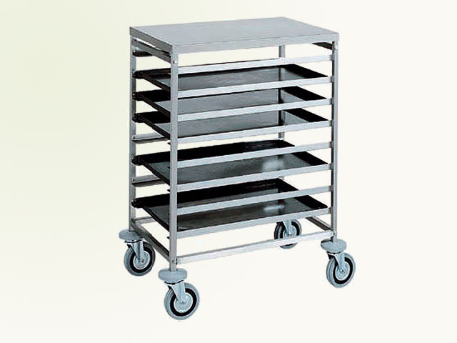 Kolica za plehove za tijesto. Struktura i vodilice od nerđajućeg čelika - gumeni odbojnici - višesmjerni točkovi ø 125 mm. Kapacitet 8 plehova 60 x 40 cm. Plehovi nisu uključeni u cijenu.