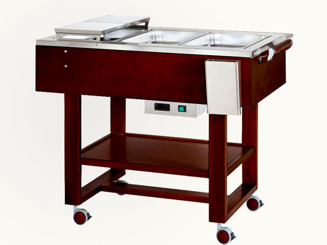 Drvena termo kolica, idealna za kuhano meso i pečenje. Potporna konstrukcija od šperploče - spremnik od nerđajućeg čelika AISI 304 opremljen odvodom. Posude nisu uključene u cijenu.