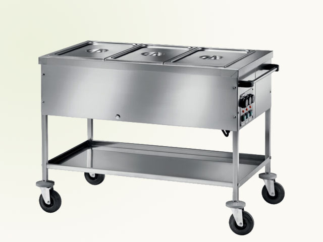 Kolica za termalnu kupku s diferenciranim temperaturama od nerđajućeg čelika AISI 304. Struktura od nerđajućeg čelika AISI 304 - spremnik s dvostrukim stijenkama sa odvodnom slavinom na dnu - podesivi termostat - odbojnici - višesmjerni točkovi ø 125 mm. Posude nisu uključene - navedenu radnu temperaturu treba uzeti u obzir s poklopcima na posudama.