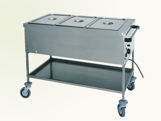 Termo kolica. Struktura od nerđajućeg čelika AISI 304 - spremnik s dvostrukim stijenkama - podesivi termostat - višesmjerni točkovi ø 125 mm. Posude nisu uključene u cijenu , navedenu radnu temperaturu treba uzeti u obzir s poklopcima na posudama.
