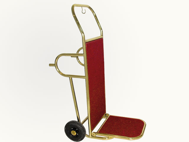 Kolica za prtljag. Sklopiva baza sa prekrivene crvenim tepihom - struktura dostupna od mesinganog ili nerđajućeg čelika - 2 potporne noge - točkovi ø 250 mm. Maksimalno opterećenje 100 kg.
