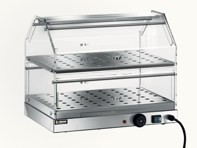 Topla vitrina. Struktura od nerđajućeg čelika AISI 304 - stranice i vrata s obje strane od prozirnog pleksiglasa- dvije police - podesivi termostat - uređaj za odvlaživanje.