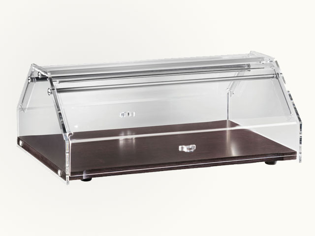 Vitrina za peciva. Drvena ploča u boji wengé. Kupola od pleksiglasa s vratima koja se otvaraju na dvije strane.
