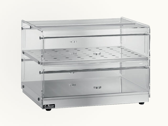 Neutralna vitrina s dvije police. Struktura od nerđajućeg čelika AISI 304 - stranice i vrata s obje strane od prozirnog pleksiglasa - uređaj za odvlaživanje.