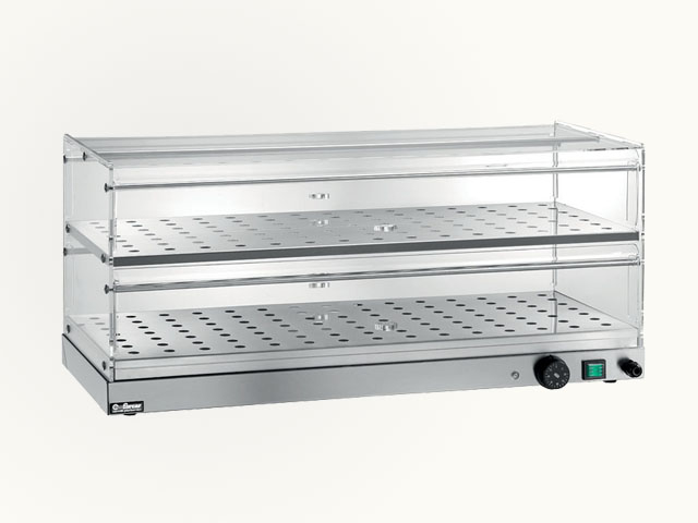 Topla vitrina sa dvije police. Struktura od nerđajućeg čelika AISI 304 - stranice i vrata s obje strane od providnog pleksiglasa - podesivi termostat - uređaj za odvlaživanje.