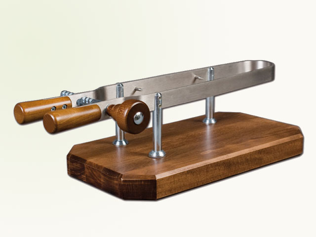 Držač za šunku, tijelo od nerđajućeg čelika. Nosač i ručke od finog drveta.