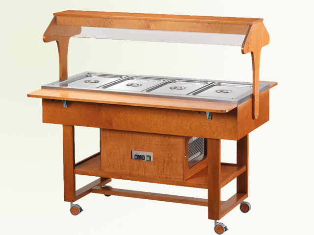 Drvena rashladna vitrin s neonskim svjetlom. Višeslojna struktura drva breze – kupola od pleksiglasa – statično hlađenje – 2 sklopive police – 1 neonsko svjetlo – višesmjerni točkovi ø 75 mm. Spremnici nisu uključeni – navedene radne temperature treba uzeti u obzir s poklopcima na posudama.