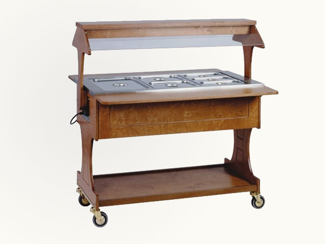 Drvena kolica bagno maria. Točkovi ø 7,5 cm od kojih su dva s kočnicama. Posude nisu uključene u cijenu. Navedene temperature treba uzeti u obzir s poklopcima na posudama.
