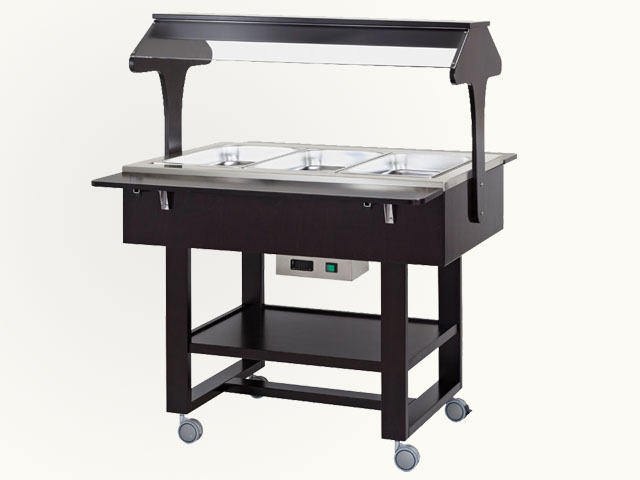 Drvena kolica bagno maria. Točkovi ø 7,5 cm od kojih su dva s kočnicama. Posude nisu uključene u cijenu. Navedene temperature treba uzeti u obzir s poklopcima na posudama.