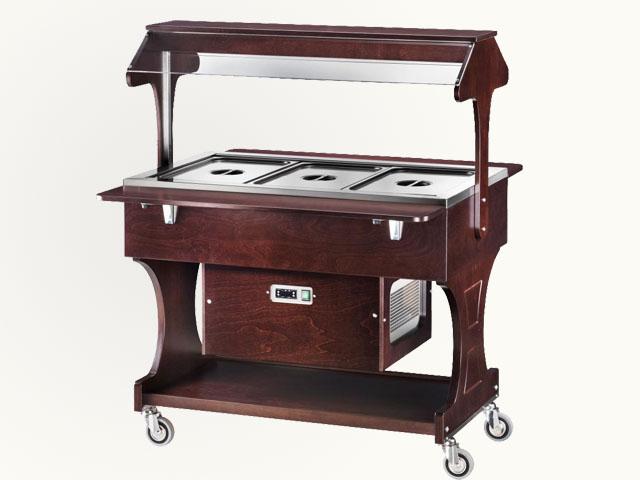 Rashladna drvena kolica . Točkovi ø 7,5 cm od kojih su dva s kočnicama. Statično hlađenje. Posude nisu uključene u cijenu. Navedene temperature treba uzeti u obzir s poklopcima na posudama.