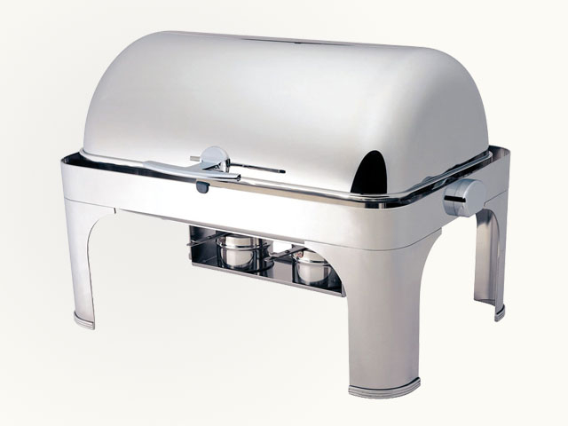 Dish posuda s poklopcem koji se otvara za 180°. Polirana konstrukcija od nerđajućeg čelika – alkoholni plamenici.