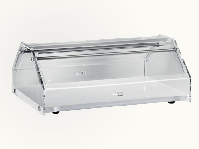 Vitrina za peciva. Drvena ploča. Kupola od pleksiglasa s vratima koja se otvaraju na dvije strane.