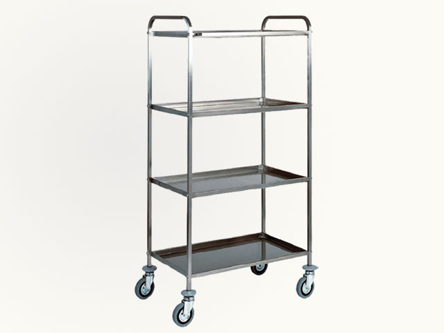 Servisna kolica sa 4 police, cjevasta struktura 20×20 mm od nerđajućeg čelika AISI, zvučno izolirane police – gumeni amortizer – višesmjerni točkovi ø 125 mm.