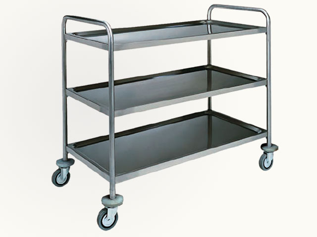 Servisna kolica, cjevasta struktura ø 25 mm od nerđajućeg čelika - police od nerđajućeg čelika, zvučno izolirane - gumeni odbojnici - višesmjerni točkovi ø 125 mm.