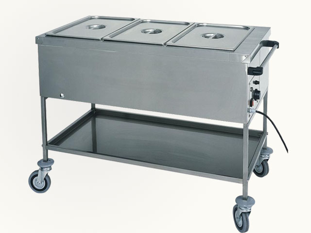 Termo kolica. Struktura od nerđajućeg čelika AISI 304 - spremnik s dvostrukim stijenkama - podesivi termostat - višesmjerni točkovi ø 125 mm. Posude nisu uključene u cijenu, navedenu radnu temperaturu treba uzeti u obzir s poklopcima na posudama.