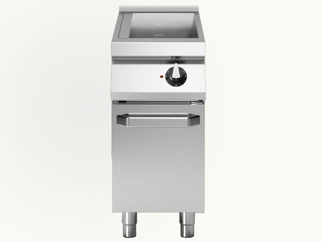 Električna bagno maria na ormaru sa vratima. Izrađena od inoxa. Jedna posuda dimenzija 351 x 516 x 155 mm, zapremine 19 l. Snaga 1,5 kW. Monofazno napajanje.